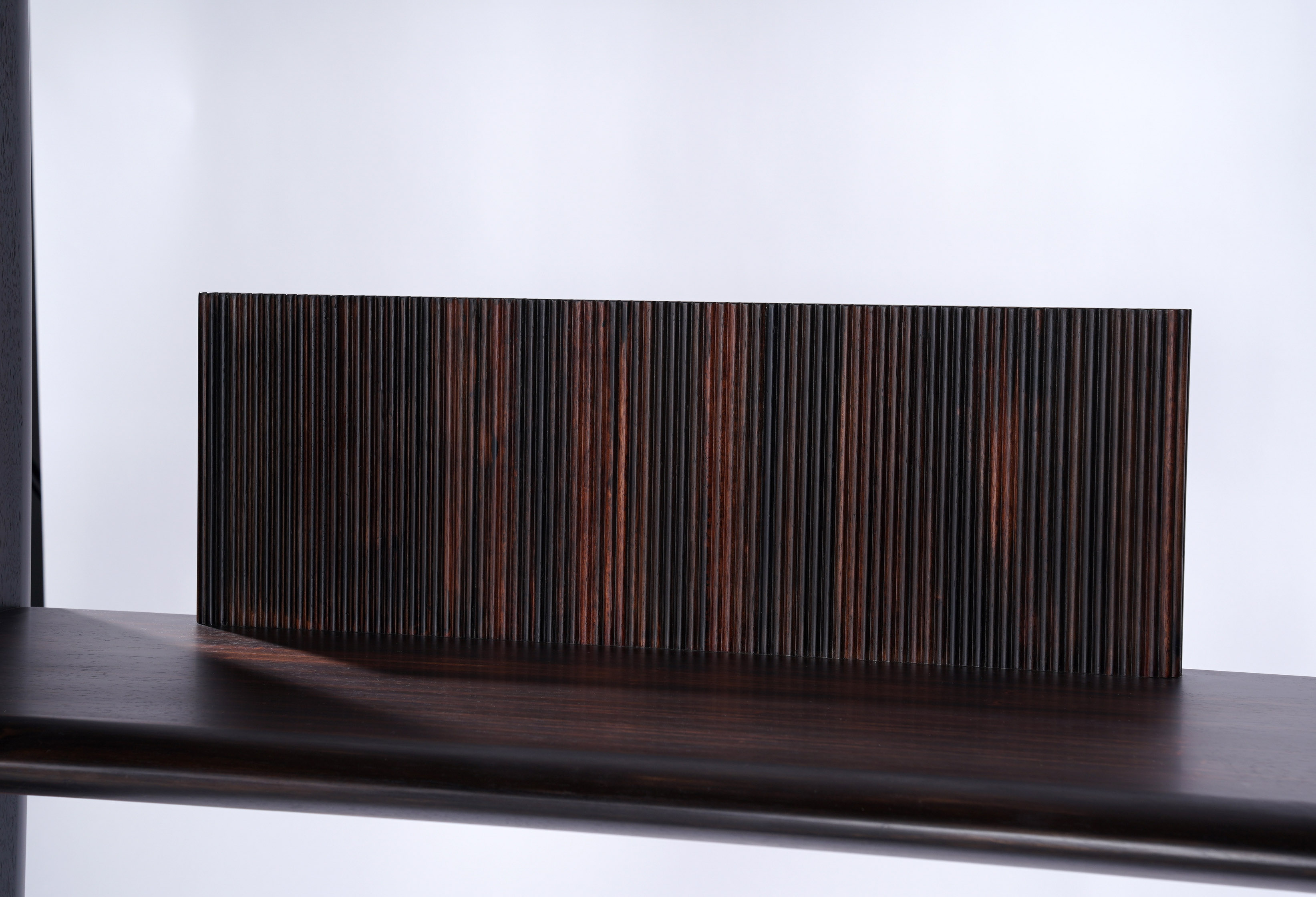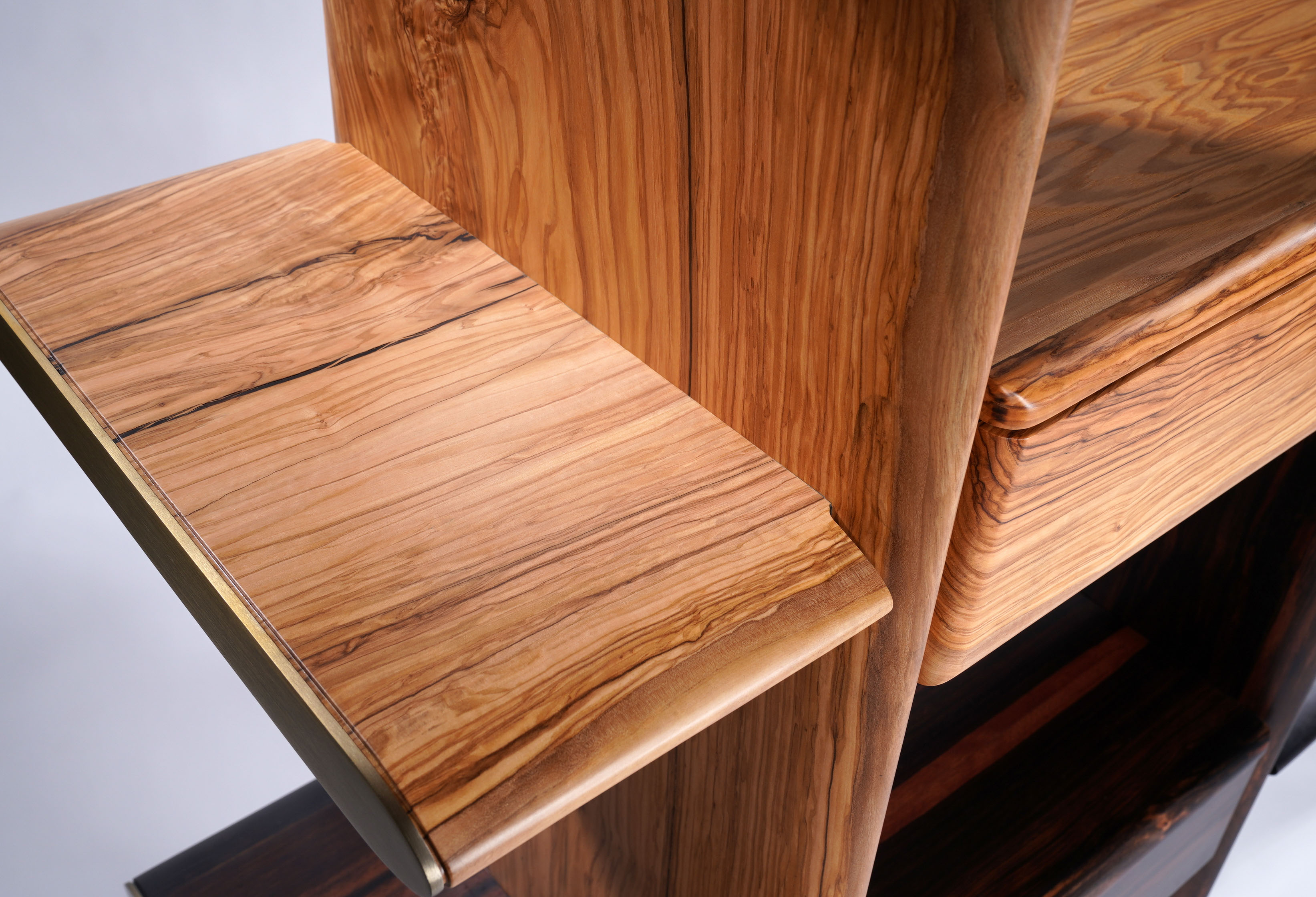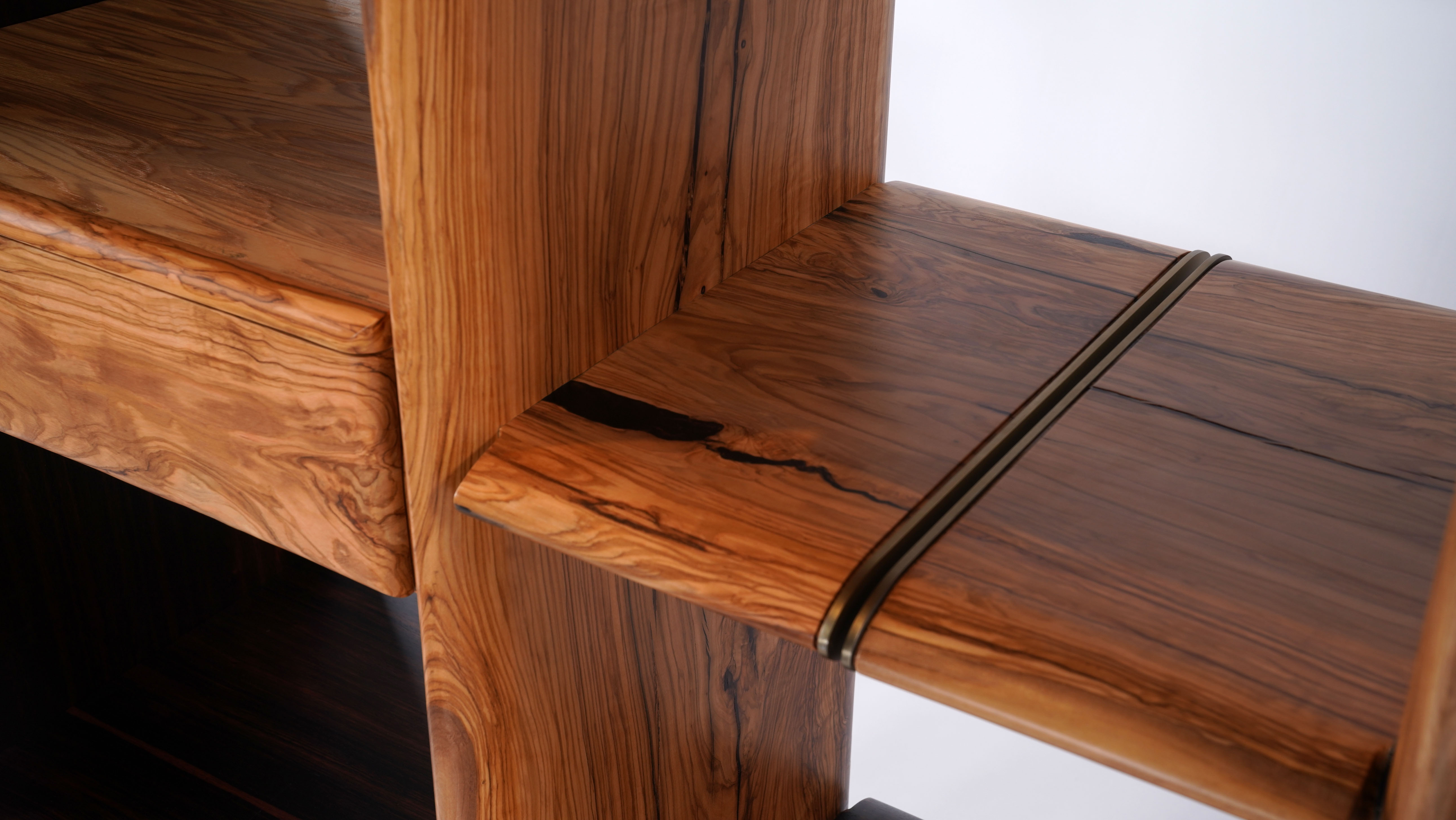茶柜基于简洁的形态,以板材之间横竖的穿插展开设计;茶柜由多种材质、多种元素 和多个部件组合而成,以意大利橄榄木、印尼条纹乌木、亚克力为主材,自然地组合在一起, 并用金属进行局部细节的点缀。