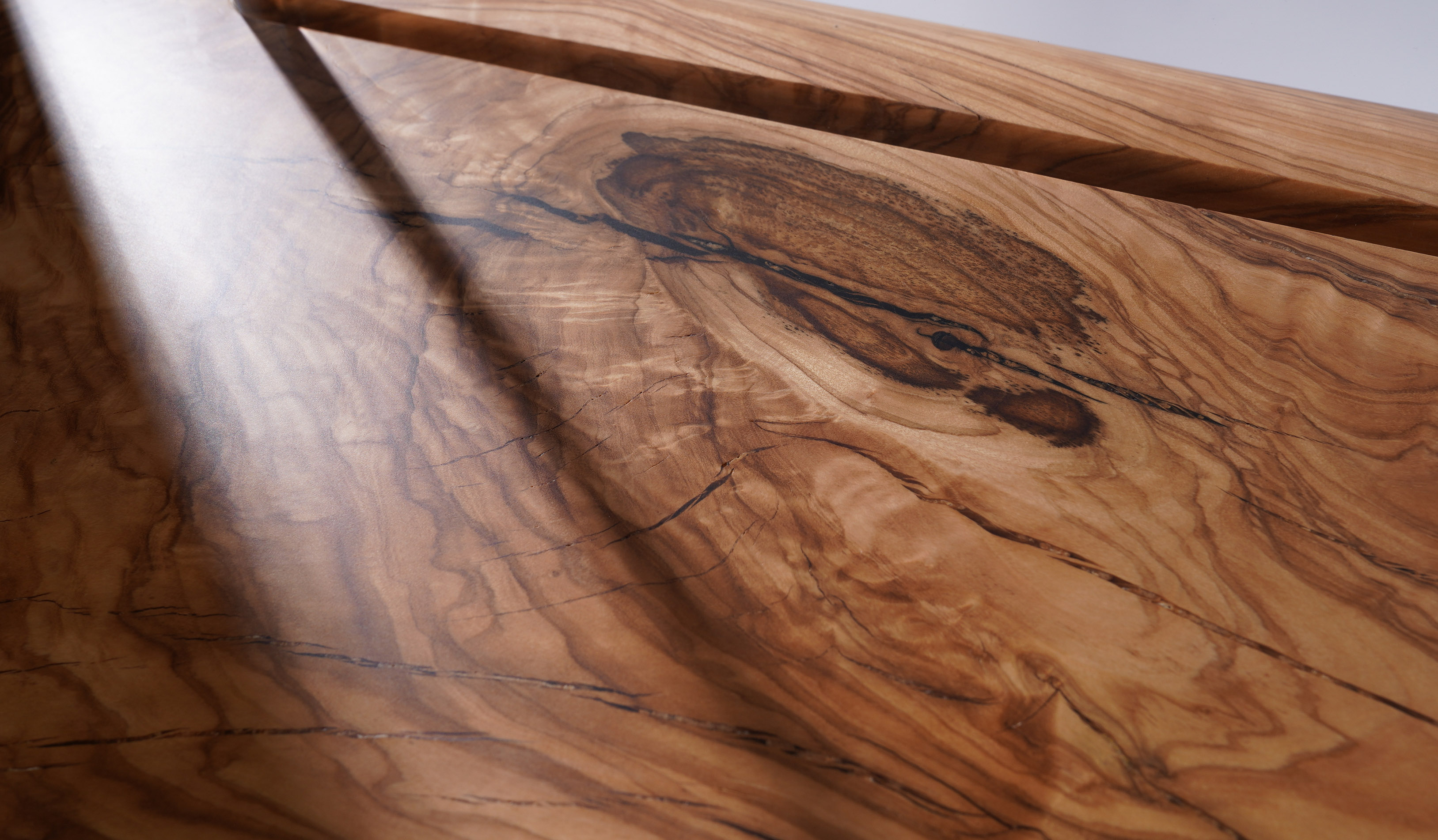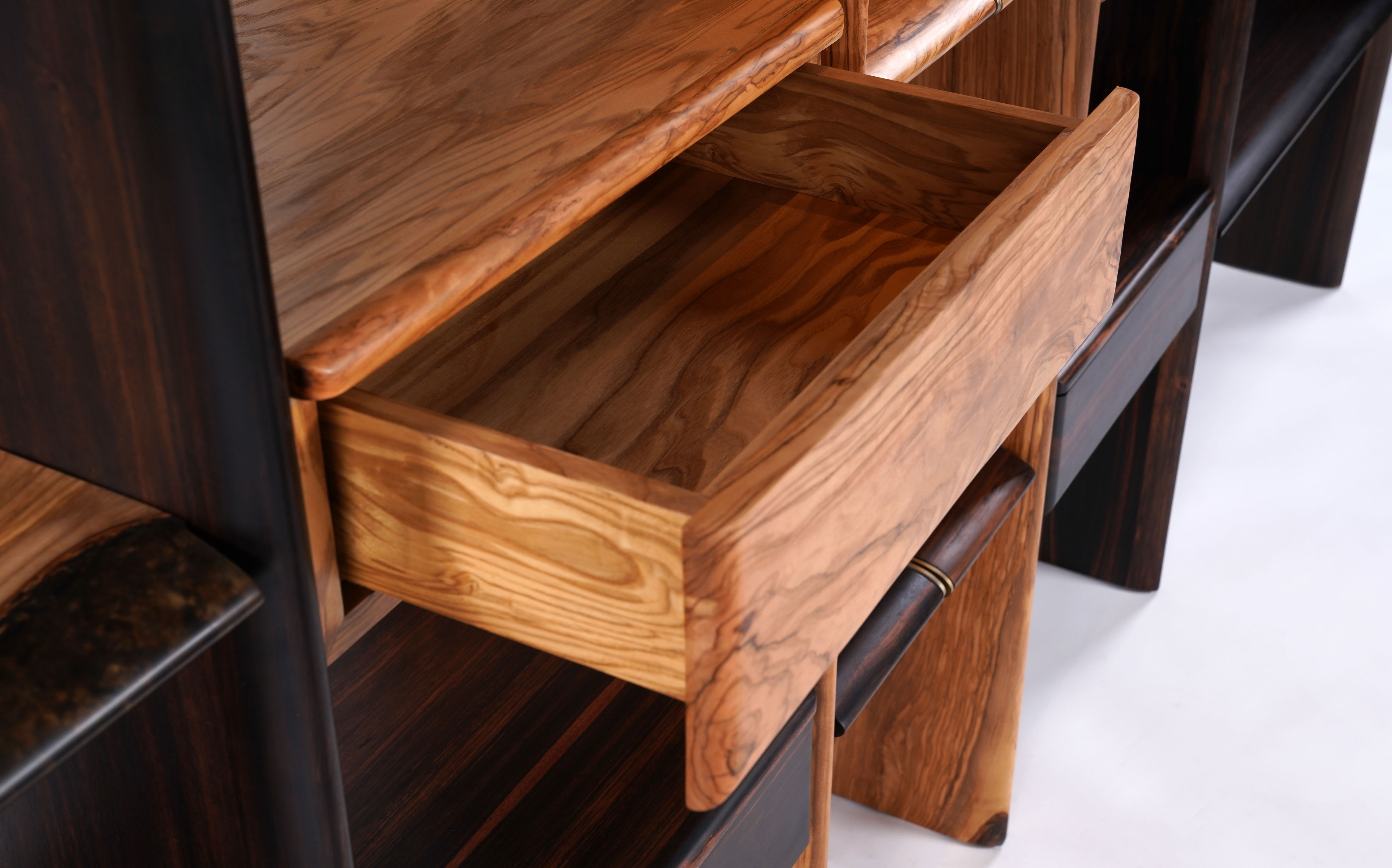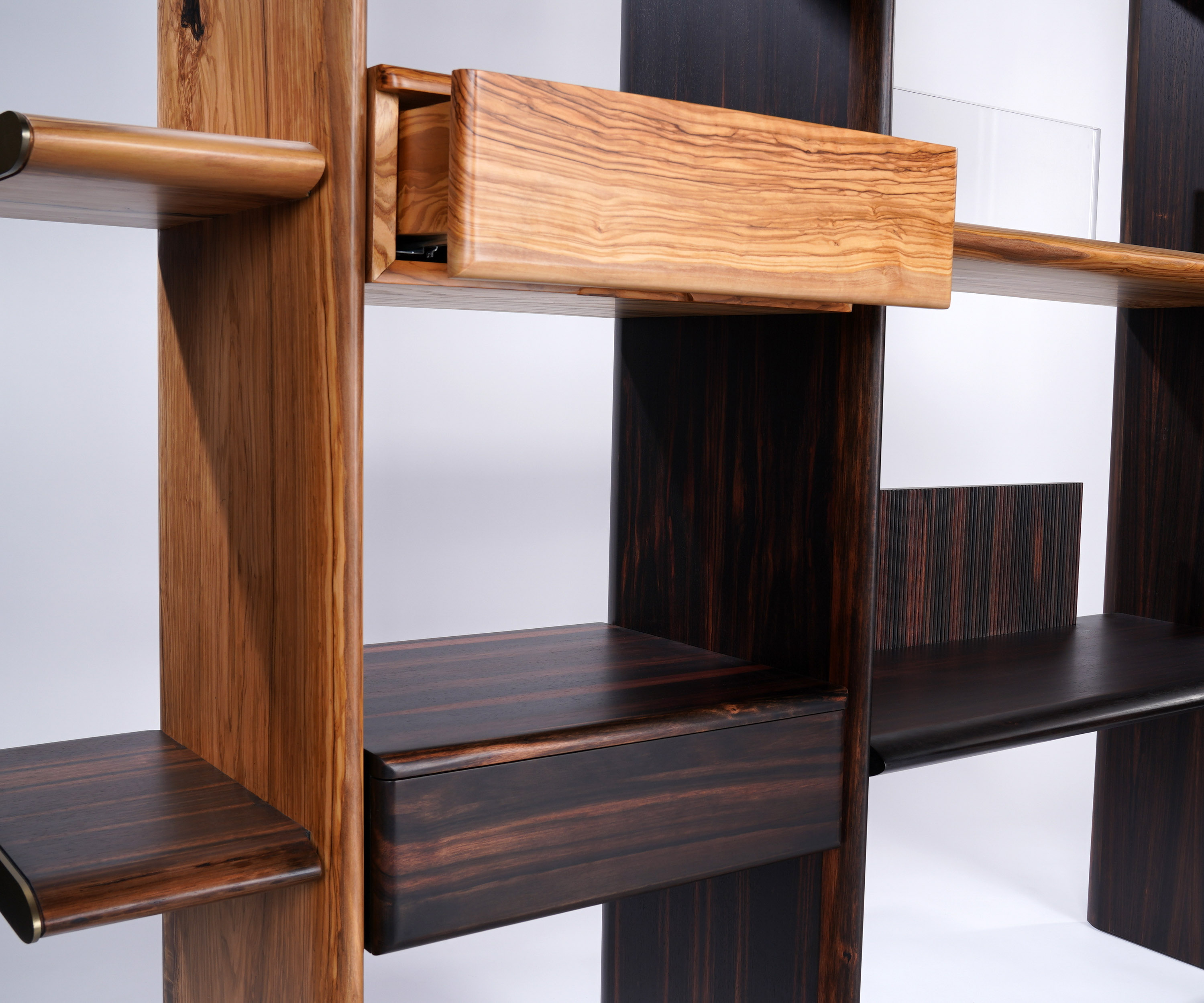 茶柜基于简洁的形态,以板材之间横竖的穿插展开设计;茶柜由多种材质、多种元素 和多个部件组合而成,以意大利橄榄木、印尼条纹乌木、亚克力为主材,自然地组合在一起, 并用金属进行局部细节的点缀。